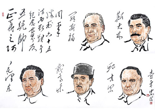 红色书画家成忠臣为纪念世界反法西斯战争胜利六十五周年而创作的巨幅《正义之师五统帅像》
