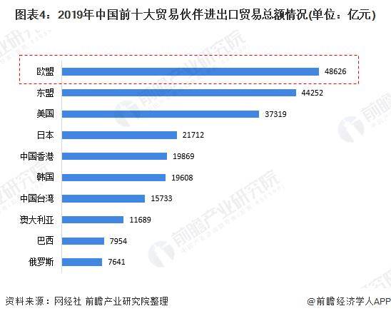 随着国内制造业和电商的发展,跨境物流企业逐步完成了海外自动化仓储中心的布局、覆盖全球的高效服务网络搭建和国际智能物流管理体系建设。中国物流企业将逐渐构建在海外的智能化、集约化的国际竞争优势,这个方向上的企业有着巨大的投资空间。在未来跨境物流行业的潜力市场方面,根据2019年中国前十大贸易伙伴进出口贸易总额来看,我国对欧盟国家的进出口贸易总额达4.86万亿元,贸易总额排名首位。