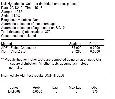 ADF检验的结果比较显著,说明lnx8是一阶平稳的。其他的变量也可以使用同样的方法进行检验