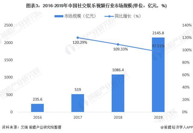 数据显示,2016-2019年中国社交娱乐视频行业市场规模增长迅速,2019年行业市场规模达到2145.8亿元左右,相较于2018年增长了97.51%,行业未来仍保持持续高速增长。