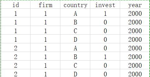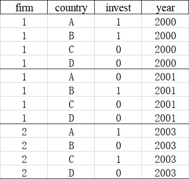 研究企业对外直接投资的区位选择问题,数据结构如上图,因变量为invest(虚拟变量);由于解释变量同时包括只随个体(企业)变化的和只随方案(国家)变化的,打算选择混合Logit模型进行回归。参考了陈强老师的《高级计量经济学及stata应用》,但由于一个企业一年选择不止一个东道国进行投资,似乎不满足条件。