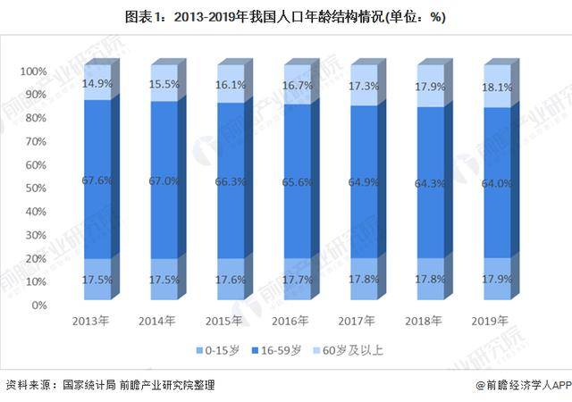 从我国人口年龄结构方面来看,2013-2019年,我国0-15岁占总人口的比重呈上升的态势。截止到2019年末,我国0-15岁、16-60岁的人群占总人口的比重分别为17.9%、64.0%。