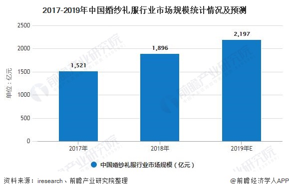 1、2019年中国婚纱礼服行业市场规模将突破2000亿元