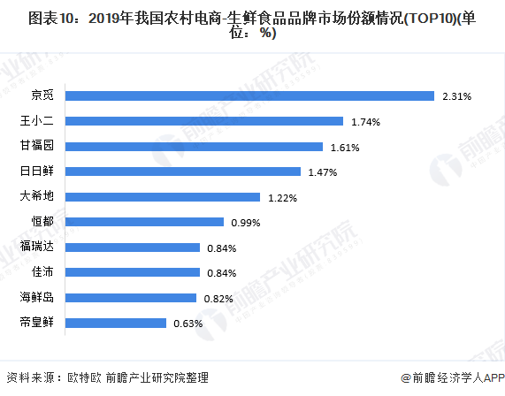 数据显示,2019年,我国重点农产品-生鲜食品从品牌电商市场份额来看,京觅、王小二和甘福园的市场份额排名前三,其网络零售额占全国县域农产品网络零售额比重分别为2.31%、1.74%和1.61%。