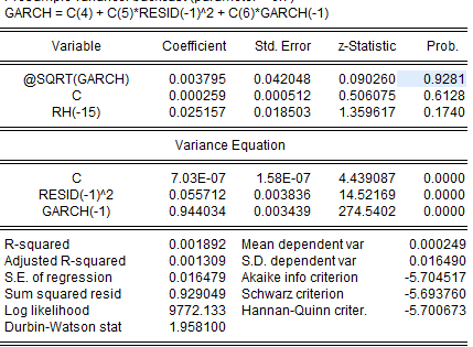 你说反了吧?看你的方程应该是GARCH-M模型,收益率方程中的波动率前面的系数不显著,说明波动率不会对收益率产生影响