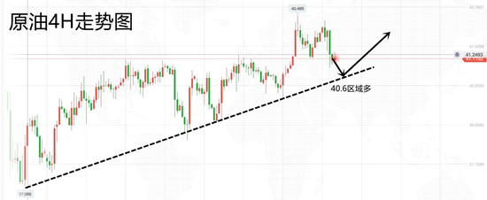 原油在42.5一线承压后再次回落,整体上原油维持在40附近震荡的格局并未发生变化。4小时图价格整体维持在上涨趋势线的上方,欧盘回撤接近上涨趋势线附近参与多头。
