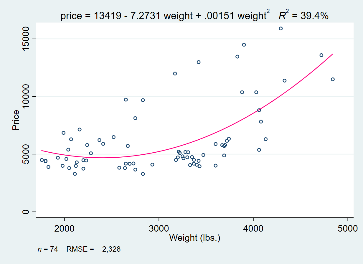 请问stata作图中,对散点qfit二次拟合后怎么添加拟合曲线方程注释和R^2在图中