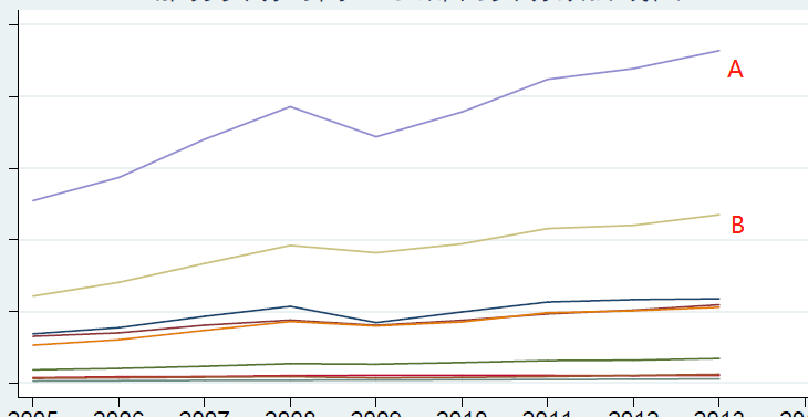 tw (line var1 t), xtitle(“第一行” “第二行”) //修改x轴标题为两行及相应内容