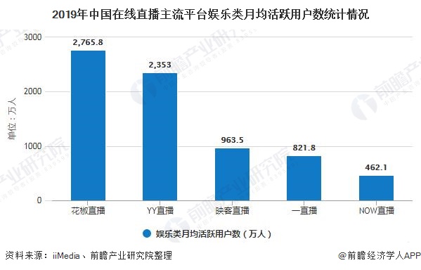 3、2019年中国在线直播主流平台移动端月均活跃用户数