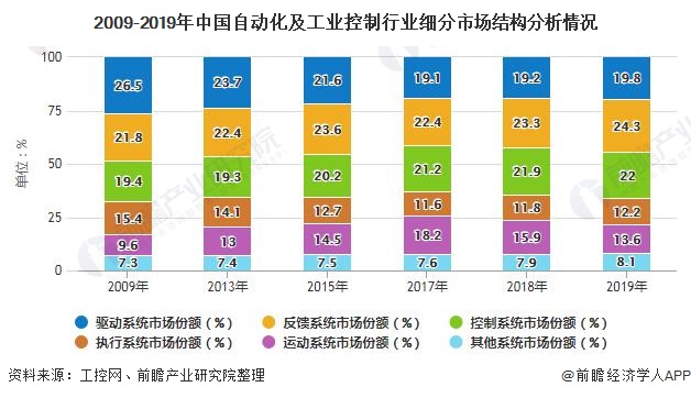 根据工控网数据,2019年中国自动化及工业控制市场中三个最主要的细分市场为反馈系统、控制系统以及驱动系统,占比分别为24.3%、22.0%和19.8%.