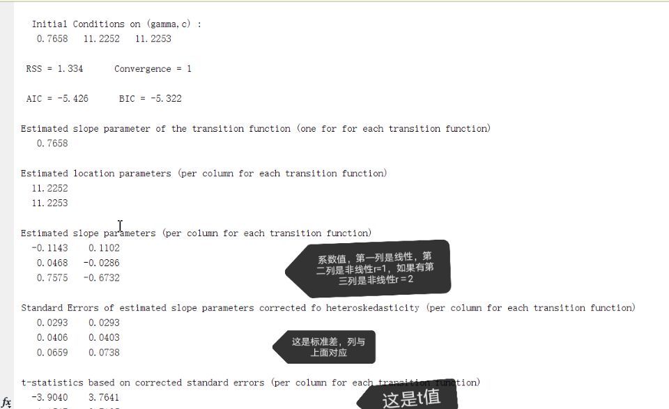 结果解释:文件解压后放一个文件夹里,然后直接点击主程序pstr就行,其他的是脚本,不用管;结果跑出来之后左下角有res,里面点开就是结果,比如先跑的一个转换变量结果就有res1,res2,分别为m等于1和2时的结果,点开里面会显示模型选择的m和r值,r值判断是根据wald,fisher那三个值得显著性(代码下面运行结果栏自己查找),分别m为1,m为2时各对应一个最优r值;m值判断根据res里面的aic IBC 最小化,原则判断;系数也是在res的beta里面,第一列是线性,后面都是非线性。。。可以看看压缩包里面的文献,对应的很清晰