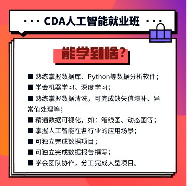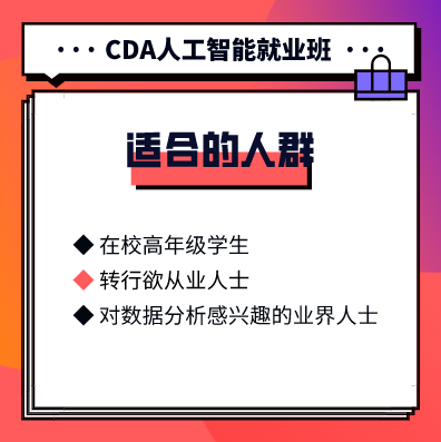为了更多有志人士实现AI梦,进入人工智能行业,CDA数据分析师针对时间充裕、零基础的专科和本科在校生、待业、及期待从事数据分析工作的小伙伴们,量身打造了《CDA人工智能就业班》。