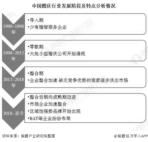 我国婚庆产业总体而言经历了四大发展阶段,1990-1998年是我国婚庆行业的导入期,市场上鲜见婚嫁服务企业,靠个体经济或朋友帮忙完成婚嫁仪式。1998-2012年,行业进入零散期,业内涌现出大批小型婚庆公司,规模较小,服务品类较为单一。后期主要采取广告战、价格战等方式取得市场。