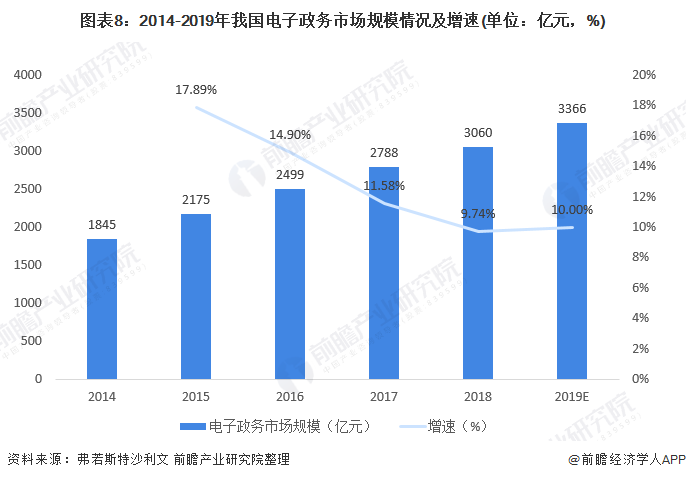 2018年电子政务市场规模为3060亿元,同比增长9.74%,初步估计2019年我国电子政务市场规模保持较高增速增长,市场规模近3366亿元。