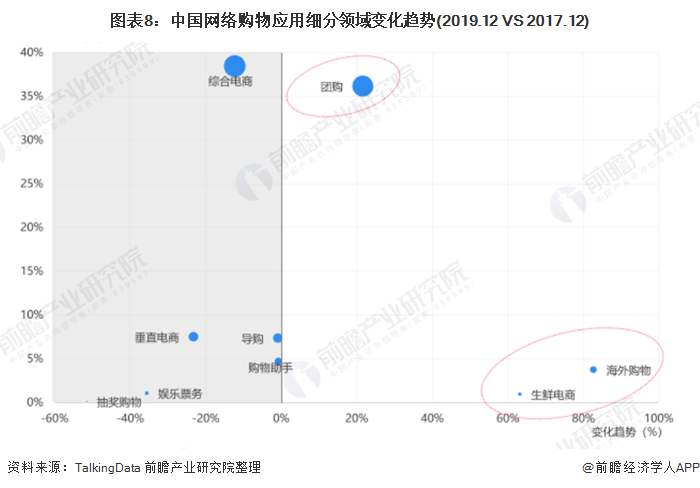 在网络购物中,生鲜和海外购物两大细分市场增长趋势显著。根据TalkingData的数据显示,从2017年12月到2019年12月,生鲜电商全网渗透率增长率超过60%,海外购物渗透率增长超过80%。