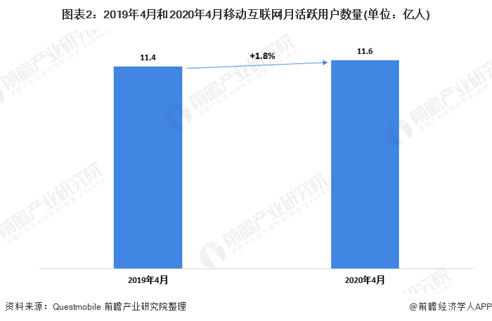 2020年4月,我国移动互联网月活跃用户数量为11.6亿人,较2019年4月同比增长1.8%,整体增速放缓。