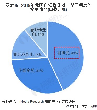 同时,这也催生了我国年轻一代对于未来购房观念的转变,不再像老一辈一样,购房可以不是年轻一代人生必做清单项目之一。在2019年白领群体对购房需求的调研中,我国有近一半的白领能够接受一辈子租房;而15%和11%的白领表示看经济条件和看政策走向,仅有31%不能接受一辈子租房。