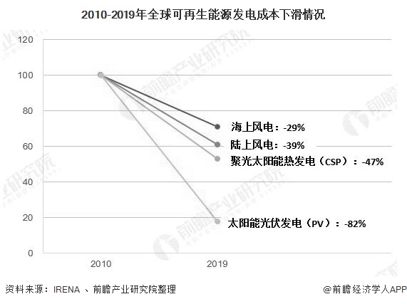 受技术进步、规模化经济、供应链竞争日益激烈和开发商经验日益增长的推动,在过去十年间,可再生能源发电成本急剧下降。在2010年至2019年间,太阳能光伏发电成本下降了82%。