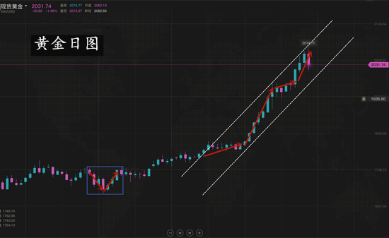 黄金周线来看,连续三周上涨,K线连阳,均线成多头排列,KDJ金叉在超买区域,随机指标略微承压,MACD金叉向上,红色能量柱持续放量,指示黄金大周期依然是是上涨形态。后市有望继续上攻,上方初步阻力是上周的高点2075一线,破位该位置有望上升到2100上方;下方支撑是5日均线1930附近,该位置也是黄金多空转折点。