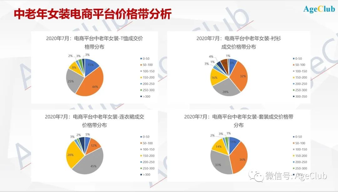 从电商平台上的中老年女装价格来看,仍然普遍停留在中低端档次。比如在T恤中,150元以下的占比84%;在连衣裙中,200元以下的占比85%。