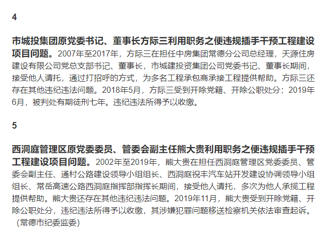 日前,常德市纪委监委对5起领导干部违规插手干预工程建设项目招投标典型案例进行了通报,对其处罚除开除党籍之外,还被判处有期徒刑,期限三年到十一年不等。