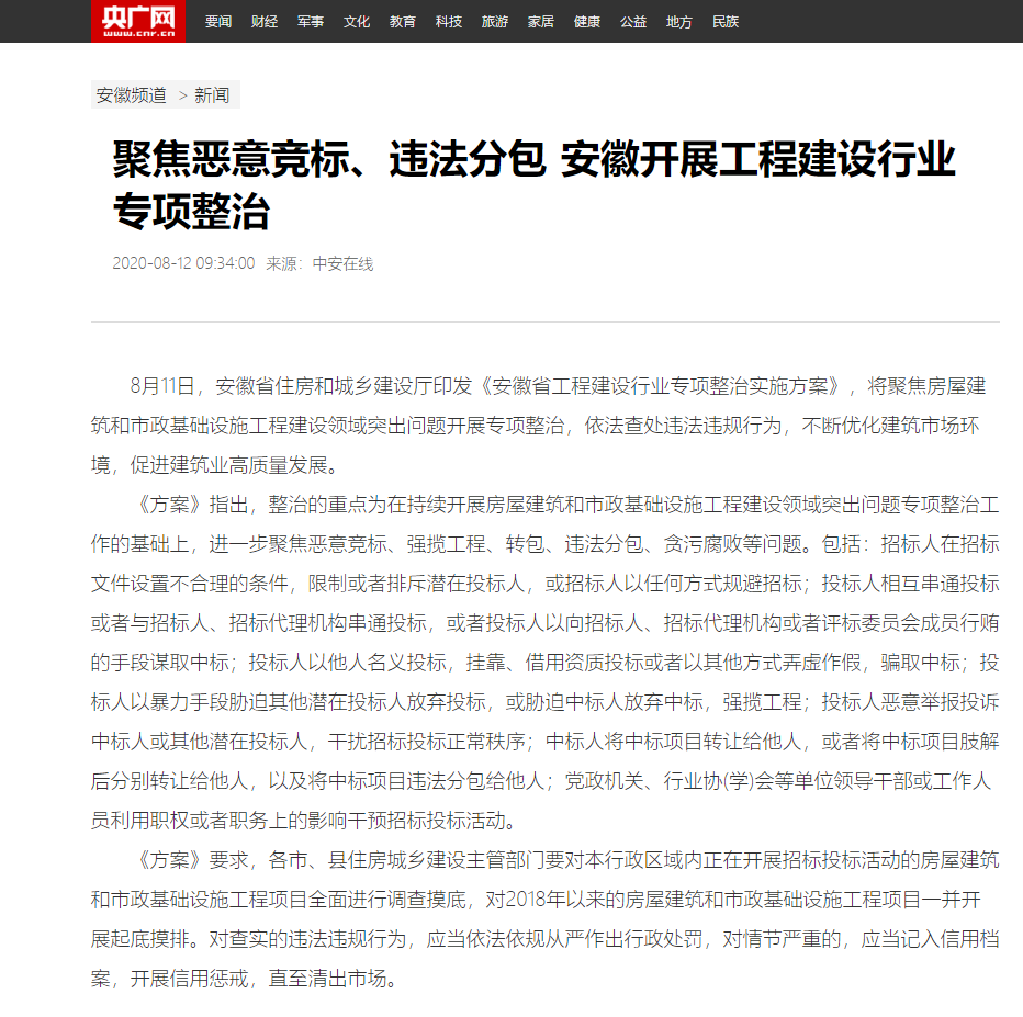 8月11日,安徽省住房和城乡建设厅印发《安徽省工程建设行业专项整治实施方案》,将聚焦房屋建筑和市政基础设施工程建设领域突出问题开展专项整治,依法查处违法违规行为,不断优化建筑市场环境,促进建筑业高质量发展。