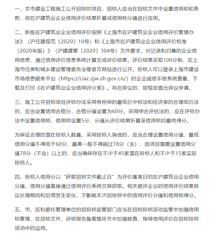 为进一步规范建筑市场秩序,建立健全建筑业企业诚信机制,营造诚信守法的市场环境,根据《中华人民共和国招标投标法》《中华人民共和国招标投标法实施条例》等有关法律法规,自2020年9月1日起,建设工程施工公开招标的项目中将使用新版在沪建筑业企业信用评价结果(2020版)。