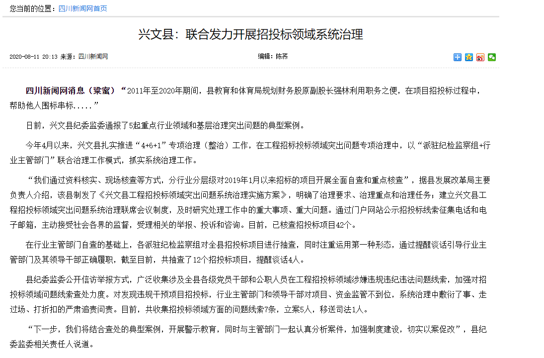 四川文兴县开展招投标领域系统治理。今年4月以来,兴文县扎实推进“4+6+1”专项治理(整治)工作,在工程招标投标领域突出问题专项治理中,以“派驻纪检监察组+行业主管部门”联合治理工作模式,抓实系统治理工作。