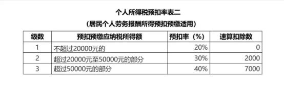 劳务报酬超过4000,按照80%计入应纳税所得额是:20万*80%=16万,对应的税率是第三等级40%,所以16万*40%-0.7万=5.7万,因此要缴纳个人所得税5.7万。