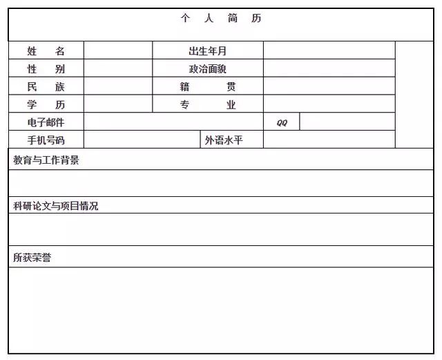 个人简历,简单的几项内容,着重让报考导师通过简历大致了解到你的学习态度、学习经历和科研潜力。其主要内容包括姓名、性别、出生年月、民族、联系电话、邮箱、英语水平、学习经历、科研成果、个人荣誉等。