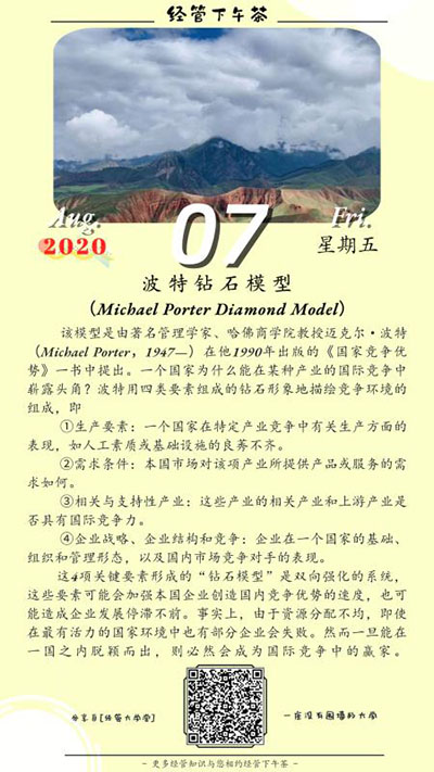波特钻石模型(Michael Porter Diamond Model)是由著名管理学家、哈佛商学院教授迈克尔·波特(Michael Porter,1947—)在他1990年出版的《国家竞争优势》一书中提出。一个国家为什么能在某种产业的国际竞争中崭露头角?波特用四类要素组成的钻石形象地描绘竞争环境的组成,即