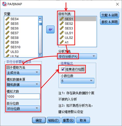 进入对话框后,首先选择要进行因子分析的变量;其次,选择分析方法,例如平行分析或者平均最小偏相关法;如果选择平行分析,则我们可以更改详细设定,例如因子提取方法、模拟数据(随机数据或者原始数据)、模拟次数和百分位分位数结果。一般情况下,不建议新手更改其中设定。最后,我们可以选择输出图形,更便于直观地查看结果。