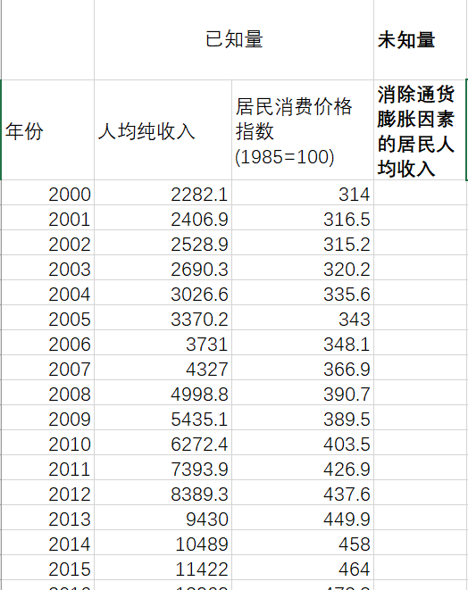 问题:用以1985年为基期的居民价格指数消除通货膨胀因素,如何得到以1985年为基期的各年度居民收入?需要求解过程。