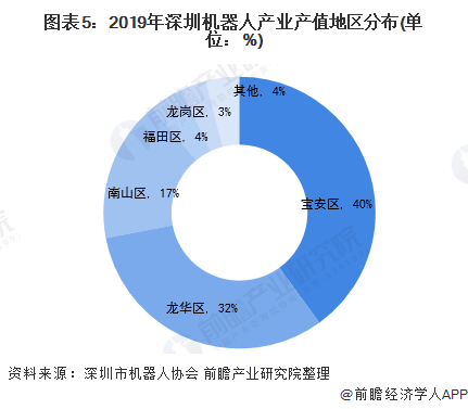 人工智能高端制造核心基地”,近年来龙华区的机器人企业也在加大产业布局。从整体来看,深圳市的机器人产业主要聚集在宝安区和龙华区,2019年两个区的产值合计占比超过了70%。