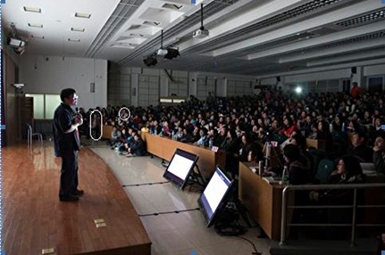 顺利找到教九的时候,离演讲开始还有十分钟左右的时间,我们一干无票人等在外排队等候,据说是要在有票的人都进去之后才能入场——当然,没有问题,在等候期间我有一次有意的转身,突然看见罗永浩从楼梯口处拐进来,于是很冷静的低声和LP说,来了。旁边的人听闻都过来问我,刚才那个穿短袖的人就是吗,我顿时生出一种优越感:不止是因为只有我一个人看到并且最先看到罗永浩,还因为这样一来,就好像我和罗永浩是多年的旧相识一样,于是就很淡定的回答说:是啊,就是胖胖的戴眼镜的那个嘛。