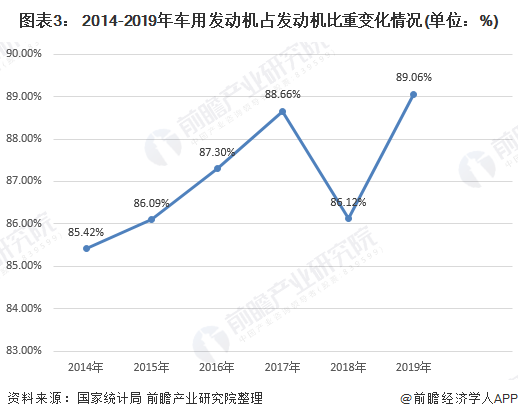 尽管如此,我国车用发动机生产仍占据了发动机生产较大的比重。2019年,我国车用发动机产量占到了发动机总产量的89.06%,份额直逼90%。
