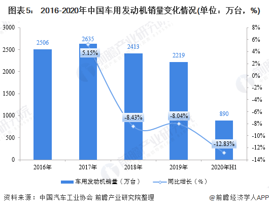 受新能源汽车(无需发动机)的替代效应影响,我国车用发动机的需求量也在逐年下滑。2019年,我国车用发动机销量仅为2219万台,较2018年下滑8.04%。2020年上半年,我国车用发动机销量实现890万台,较2019年同期下滑12.83%。