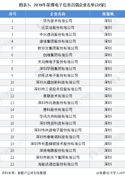 其中深圳电子信息产业规模就接近万亿元。2019年(第33届)电子信息百强企业名单发布,深圳共有22家百强公司入围,数量居全国第一,成为全国电子信息产业的“第一城”。其中,华为、比亚迪、中兴通讯、传音、大疆、深圳华强等一批在电子信息产业不同细分行业中的龙头企业在列,实力不容小觑。