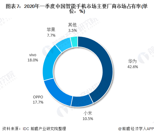 2020年一季度,广东省前三家手机企业(华为、vivo、OPPO)在中国市场智能手机出货量合计为5220万台,占全国的78.4%。