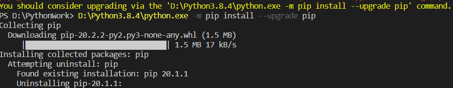 初学python的小白,在安包的时候,系统提示你这个pip不行,得升级,如下:You should consider upgrading via the 'D:\Python3.8.4\python.exe -m pip install --upgrade pip' command.在网上看了好几个版本的解决方案,有的没看懂,有的不好用,最后发现只要在终端那里输入它的提示信息就可以更新了。。。。。