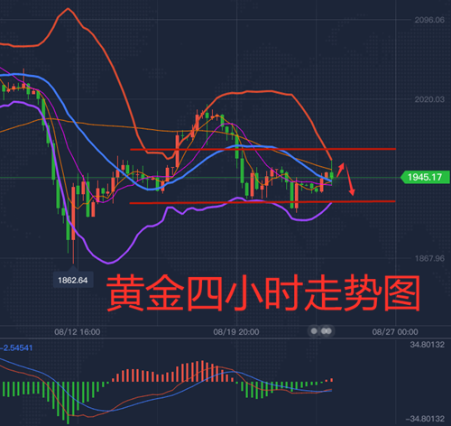 黄金走势解析:亚欧盘时间黄金从低位反弹,最高至1961.75。四小时图看,布林通道小幅收窄,维持在布林下轨与中轨之间振荡整理,短期均线EMA5与EMA10仍然空头排列,双线趋向走平。综合来看,黄金晚间操作上建议支撑先看1925一线支撑;阻力关注1965-1970附近。激进可继续尝试以择高短空为主,务必严格保持轻仓,带好止损,防止出现异常行情。