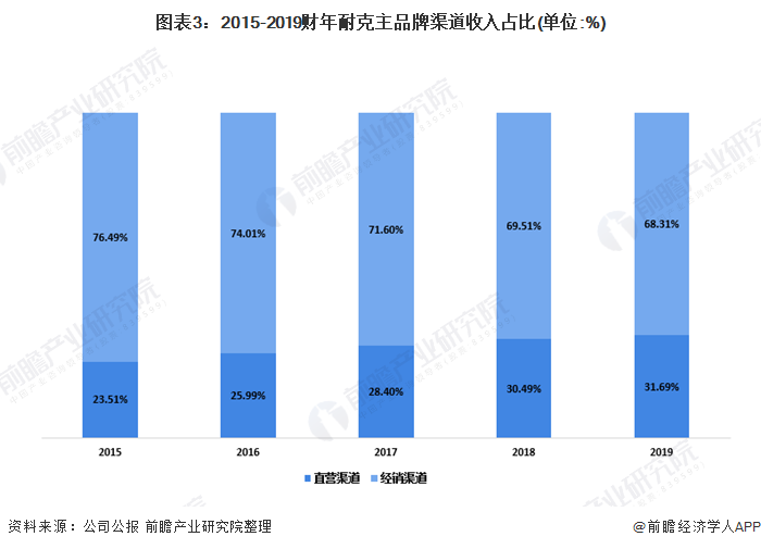 直营渠道对终端有较强的控制力,并且能够迅速对市场做出反应,因此耐克不断扩充直营渠道,直营门店数量从2014年的858家增加到2019年的1152家。
