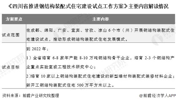 2019年3月,住建部发布的《住房和城乡建设部建筑市场监管司2019年工作要点》中要求开展钢结构装配式住宅试点;2019年7月,住建部陆续批复了山东、浙江、河南、江西、湖南、四川、宁夏等七省、自治区的试点方案,以推动建立成熟的钢结构装配式住宅建设体系。这七个省、自治区的试点方案内容如下: