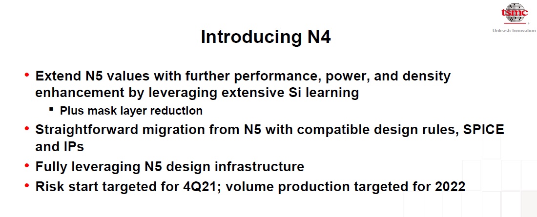 接下来,台积电还将基于N5平台推出N4工艺平台,新工艺在速度、功耗和密度都得到了进一步的提升,在设计规则、SPICE和IP方面同样与N5保持兼容,以利于在5nm和4nm之间实现无缝衔接。根据规划,N4将在2021年第四季度开始试产,并于2022年实现量产。