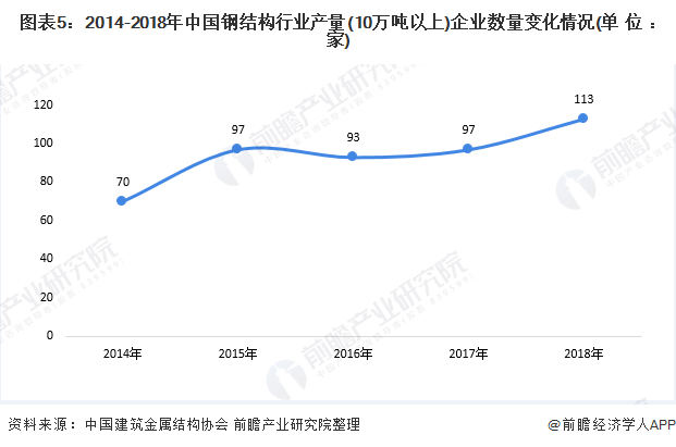从钢结构产量在10万吨以上的企业数量的变化趋势来看,2014-2018年,我国钢结构行业产量在10万吨以上的企业数量总体增长。2018年,钢结构产量在10万吨以上的企业突破100家,说明我国钢结构行业集中度有所提升。