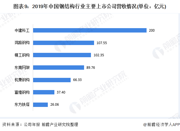 在企业竞争格局方面,随着市场化竞争的推进,我国民营企业在钢结构行业领域的竞争实力越来越强,2019年龙头企业营收稳定增长。