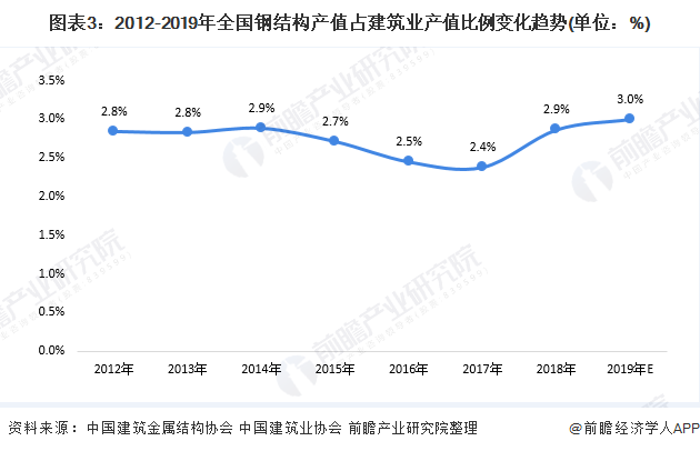 由此,2018年,我国钢结构产值达6736亿元,占建筑业总产值的2.87%。2019年,前瞻根据历年来钢结构行业产值占建筑业产值比重、以及国家相关规划目标测算,我国钢结构行业产值突破7400亿元。