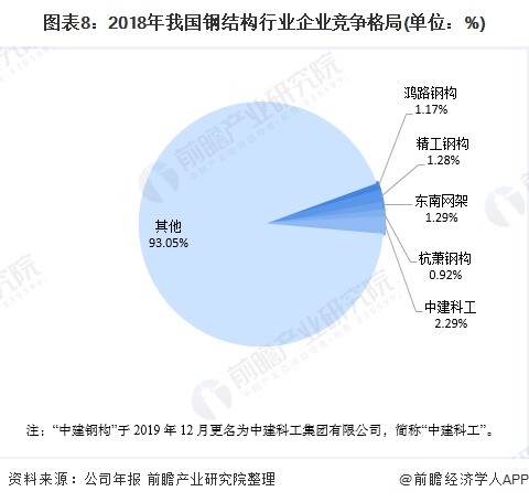 在企业竞争格局方面,据中国建筑金属结构协会披露信息显示,2018,我国钢结构行业的领先企业中,按企业性质来看,5家领先企业中,3家(精工钢构、鸿路钢构、东南网架)是民营企业,2家(中建科工、中建三局)是国企,可见,随着市场化竞争的推进,我国民营企业在钢结构行业领域的竞争实力越来越强。