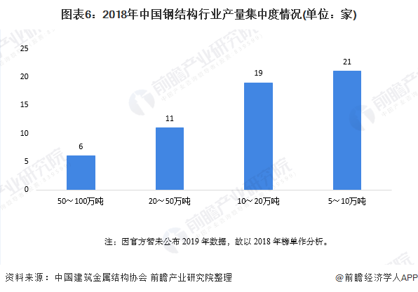 然而,目前我国钢结构行业的集中度较低,2018年,行业内有6家企业的钢结构产量在50-100万吨之间。