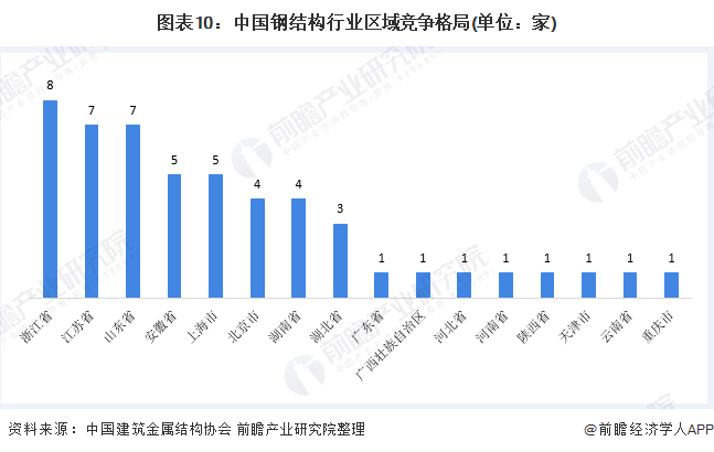 据中国建筑金属结构协会于2019年6月公布的“2018年度建筑钢结构行业50强企业”的所属地分布来看,浙江省、江苏省和山东省的上榜企业数量最多,分别有8家、7家和7家企业上榜,说明这三个省份在钢结构行业更具竞争力优势;此外,安徽省、上海市也各有5家企业上榜。总体来看,我国华东地区的钢结构企业竞争力较强。